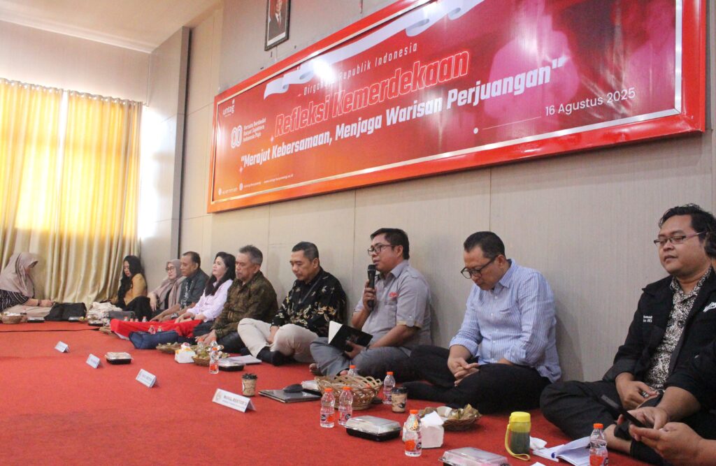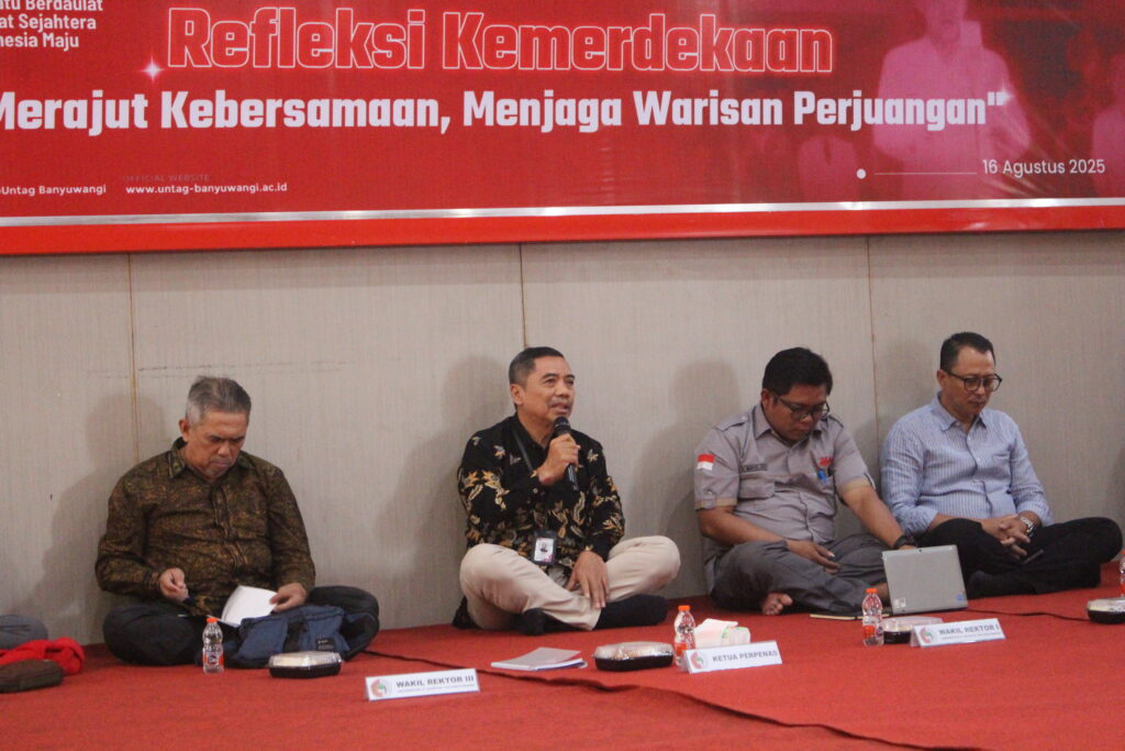 Banyuwangi, 16 Agustus 2025 – Universitas 17 Agustus 1945 Banyuwangi menggelar kegiatan Refleksi dan Dialog Kemerdekaan sebagai bagian dari peringatan HUT ke-80 Republik Indonesia. Acara ini berlangsung pada Sabtu, 16 Agustus 2025 pukul 09.00–12.00 WIB di Ruang Adi Kardono F4 dengan tema “Merajut Kebersamaan, Menjaga Warisan Perjuangan”. Tema tersebut menjadi wujud komitmen Untag Banyuwangi, yang merupakan unit dari Perkumpulan Gema Pendidikan Nasional 17 Agustus 1945 Banyuwangi (Perpenas), dalam menjaga serta merawat rasa nasionalisme di Banyuwangi maupun secara nasional.