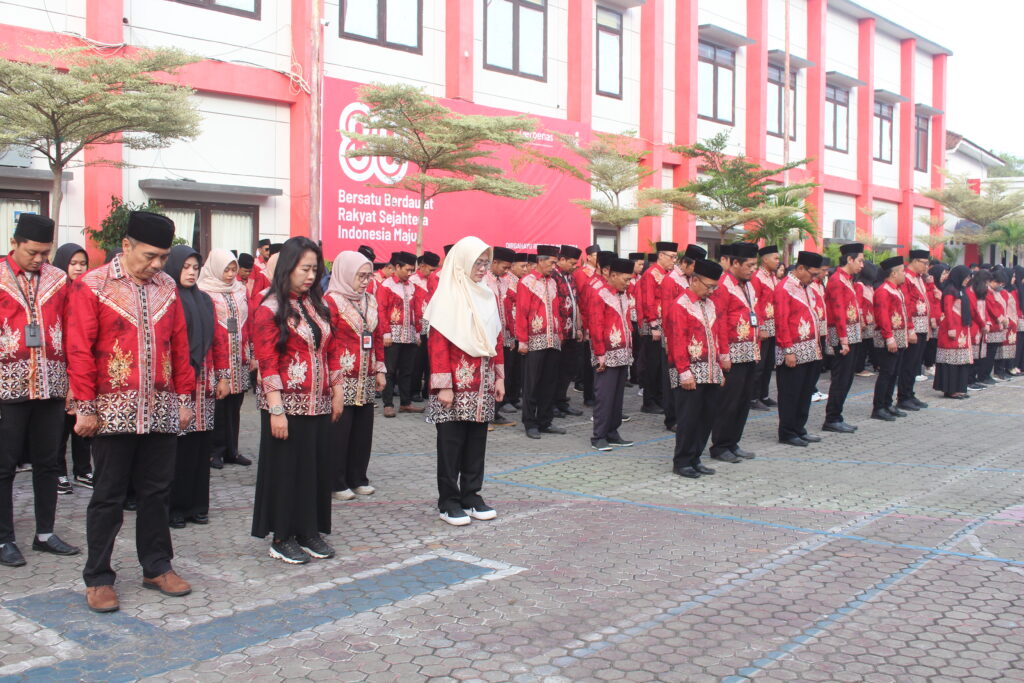 Peserta upacara yang terdiri dari siswa, mahasiswa, guru, dosen, karyawan, serta civitas akademika hadir dengan mengenakan seragam batik Perpenas dan bawahan hitam. Para peserta laki-laki tampak gagah dengan peci hitam sebagai bagian dari dresscode resmi, menambah suasana nasionalis dan penuh kebanggaan.